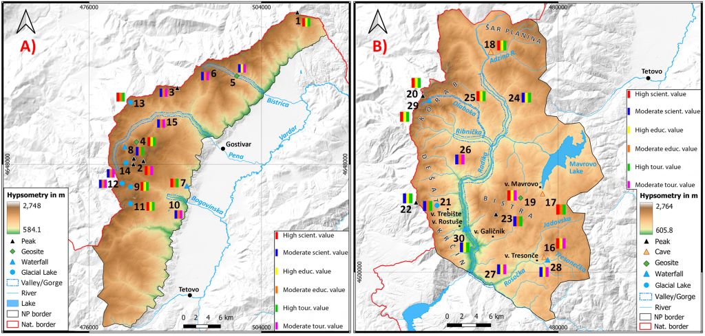 Истражувањето се фокусира на проценка на потенцијалот за туризам базиран на природа (Nature Based Tourism) во националните паркови Маврово и Шар Планина во Македонија, применувајќи ја методологијата Geosite Potential (G-P). Оваа метода овозможува евалуација на геолокалитетите врз основа на нивната научна, едукативна и туристичка вредност, како и ризикот од деградација. Клучните геолокалитети, како Лешница и Корапскиот водопад, се истакнаа со високи оценки во сите категории, што ги прави идеални за зачувување и развој на туризмот. Од друга страна, локалитети како Кањонот на Боговинска Река и Клисурата на реката Пена покажуваат умерени вредности, укажувајќи на потребата од дополнителни инвестиции во инфраструктурата.