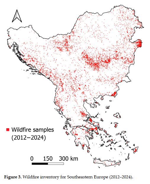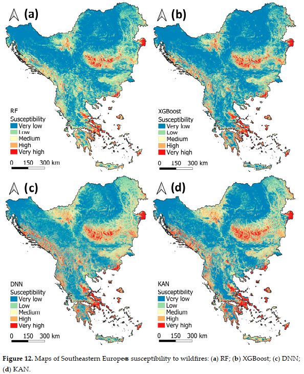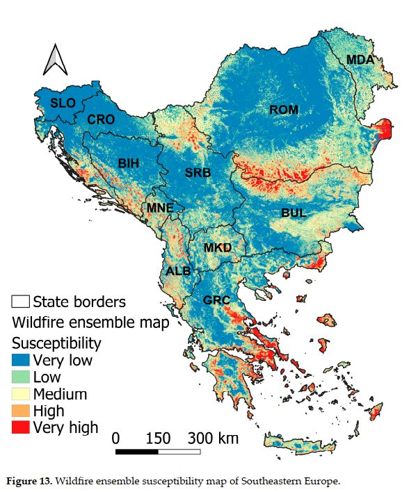Методолошки, применети се четири различни модели: два базирани на машинско учење (Random Forest и XGBoost) и два базирани на длабокото учење (Deep Neural Network и Kolmogorov–Arnold Networks). Со ова е овозможена детална споредбена анализа на нивната ефикасност при регионална просторна идентификација на подрачја со зголемена подложност на шумски пожари. Резултатите покажуваат дека површините со многу висока подложност на пожари во Југоисточна Европа варираат од 2,9% до 6,5%, во зависност од применетиот модел. Од административен аспект, Грција се издвојува како најпогодена држава. Според т.н. ансамбл-модел (оптимизирана комбинација од сите четири алгоритми), дури 10,5% од територијата на Грција припаѓа на класата со многу висока подложност, додека дополнителни 14,2% се класифицирани како високо подложни. Висок степен на подложност е утврден и во Црна Гора и Албанија. Умерено подложни се Србија, Бугарија, Романија, Хрватска, Босна и Херцеговина и Македонија, додека Молдавија и Словенија се издвојуваат како подрачја со многу низок ризик.