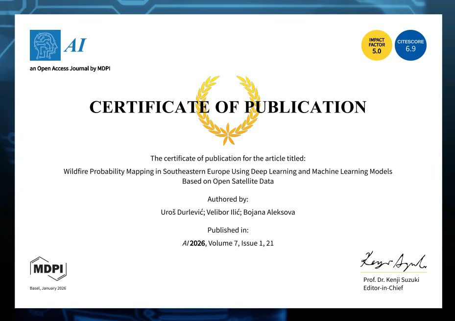 Неодамна, во меѓународното научно списание AI (IF: 5.0) беше објавен трудот „Картирање на веројатноста за појава на шумски пожари во Југоисточна Европа со примена на модели од длабоко и машинско учење базирани на сателитски податоци“, изработен од авторскиот тим д-р Урош Дурлевиќ (Србија), д-р Велибор Илиќ (Србија) и м-р Бојана Алексова (Македонија). Публикацијата претставува прва сеопфатна регионална анализа на подложност на појава на шумски пожари во Југоисточна Европа, која опфаќа дури 11 држави и површина од околу 800.000 km².