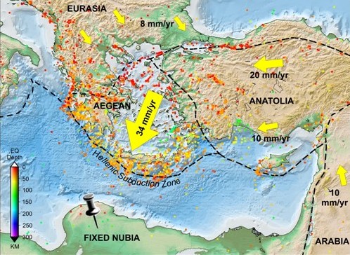 Регионот на Средоземјето (Медитеранот) сеизмички е доста активен поради судирот на Африканската и Евроазиската континентална плоча. Имено, огромната Африканска континентална